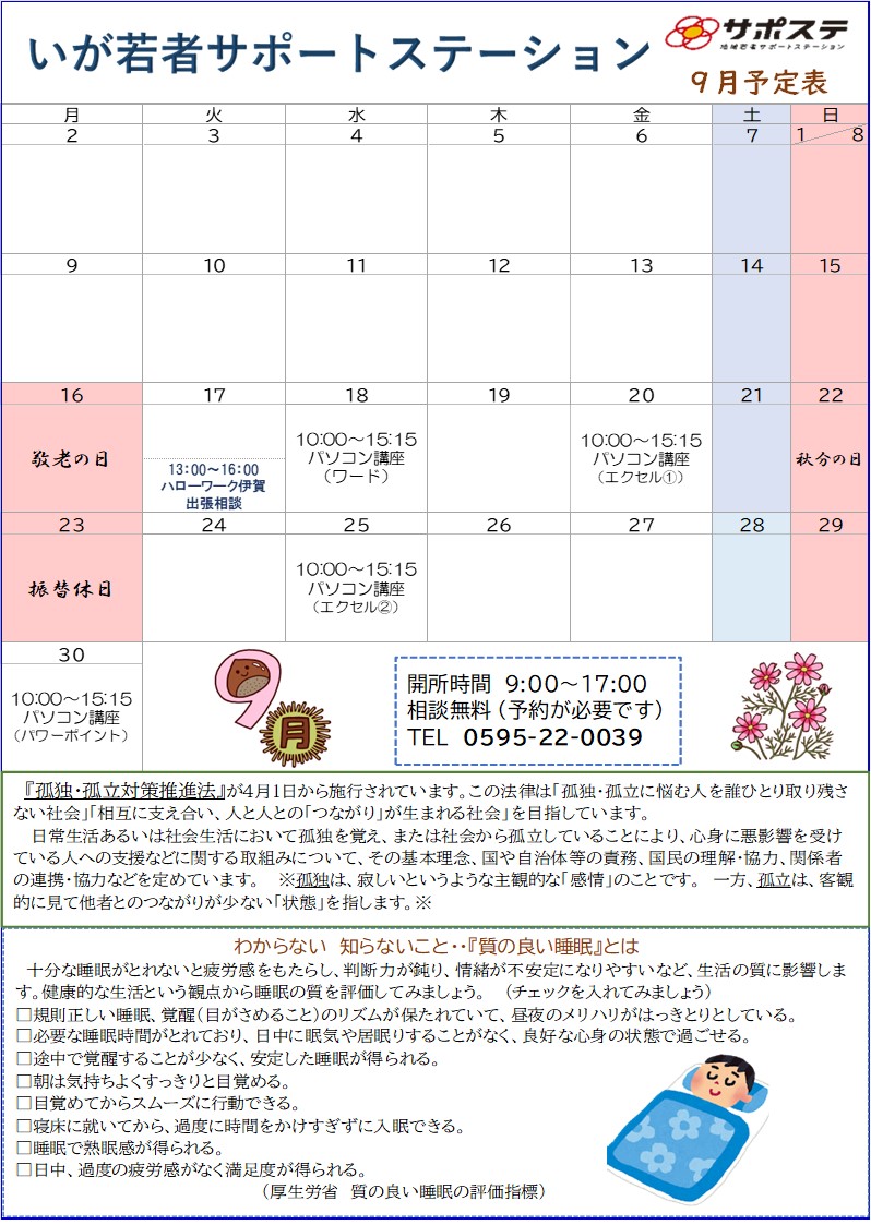 お知らせ 月間予定表 2024年8月30日 🌰9月予定表をUPします。 TOPお知らせ🌰9月予定表をUPします。 9月になろうとしていますが、まだまだ暑い日が続いています。台風も停滞していますので、身の回りのことについて、十分気をつけましょう。9月の予定表をUPします。サポステで開催して欲しい講座などがありましたら、お気軽にご連絡ください。 前の記事 次の記事 記事一覧に戻る