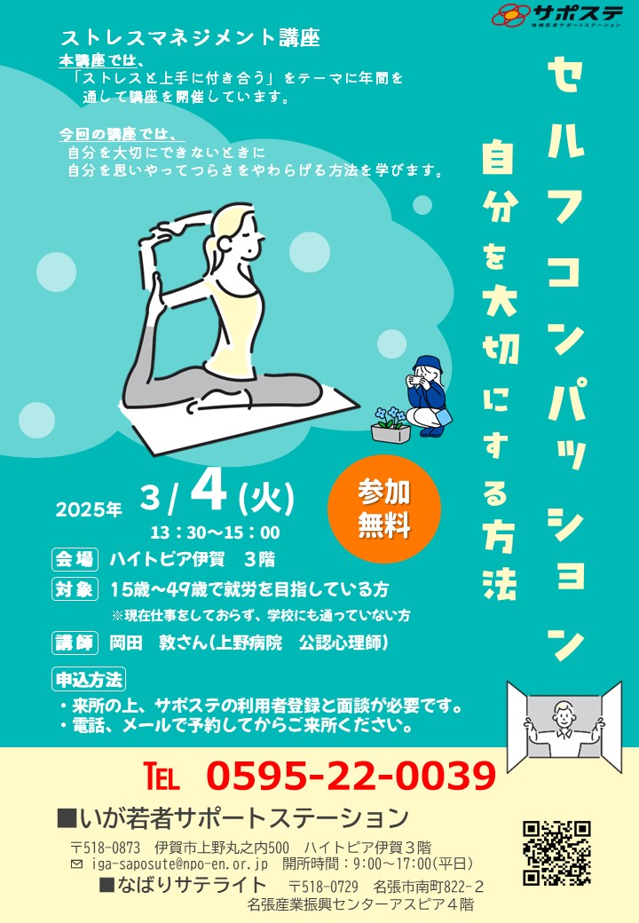 お知らせ ストレスマネジメント講座 2025年1月28日 🌼3月ストレスマネジメント講座の参加者募集中 TOPお知らせ🌼3月ストレスマネジメント講座の参加者募集中 3月のストレスマネジメント講座の参加者を募集します。 日程:3月4日(火) 時間:13時半~15時 内容:セルフコンパッション(自分を大切にする方法) 本講座は、ストレスと「上手に付き合う」をテーマに年間を通して講座を開催しています。 今回の講座では、自分を大切にできないときに自分を思いやって、つらさをやわらげる方法を学びます。 お気軽にお問い合わせください。 お問い合わせはこちら 前の記事 次の記事 記事一覧に戻る