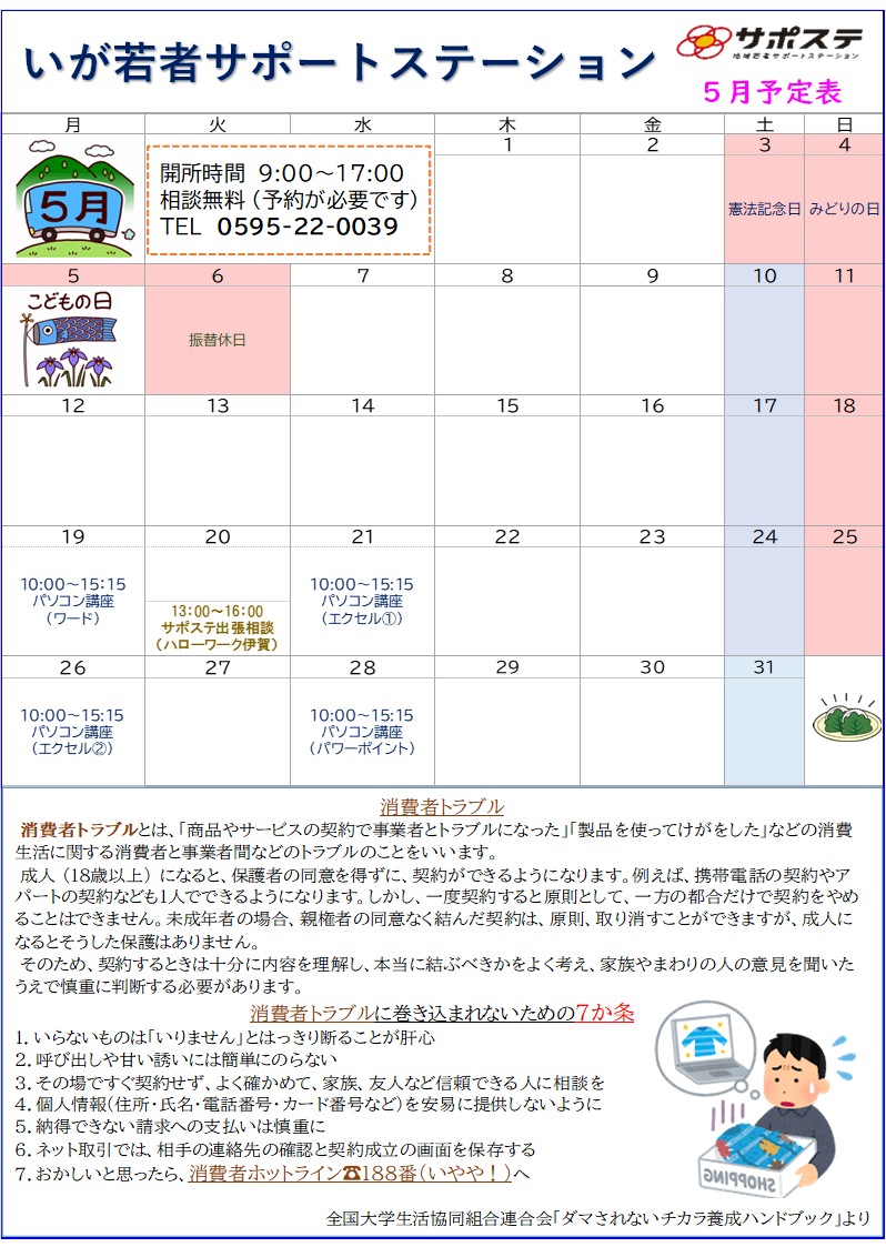 お知らせ 月間予定表 2025年5月2日 🎏5月予定表をUPします。 TOPお知らせ🎏5月予定表をUPします。 風薫る5月になりました。出かけやすい季節ですね。ぜひ、サポステにも来てくださいね。お待ちしています。 前の記事 次の記事 記事一覧に戻る