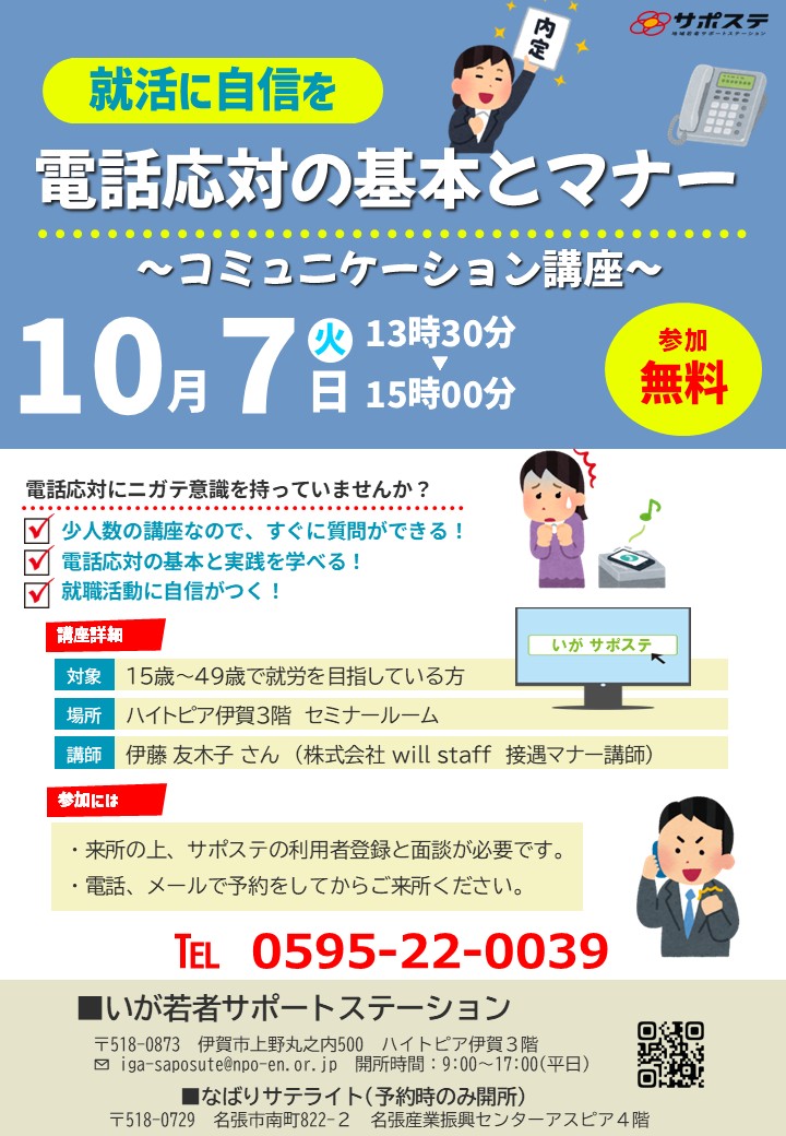 お知らせ コミュ二ケーション講座 2025年9月26日 🍠10月コミュニケーション講座の参加者を募集します TOPお知らせ🍠10月コミュニケーション講座の参加者を募集します コミュニケーション講座では相手との人間関係を構築するためのポイントや 仕事をする上で必要なビジネスマナーを学びます。 日程:10月7日(火) 時間:13時半~15時 内容:電話応対の基本とマナー 対象:15~49歳で働いていない方(現在仕事をしておらず、学校に通っていない方) ➩来所の上、サポステへの利用者登録と面談が必要です。 ➩電話、メールで予約してからご来所ください。 まずはお気軽にお問合せください。 ℡0595-22-0039 お問合せはこちら 前の記事 次の記事 記事一覧に戻る